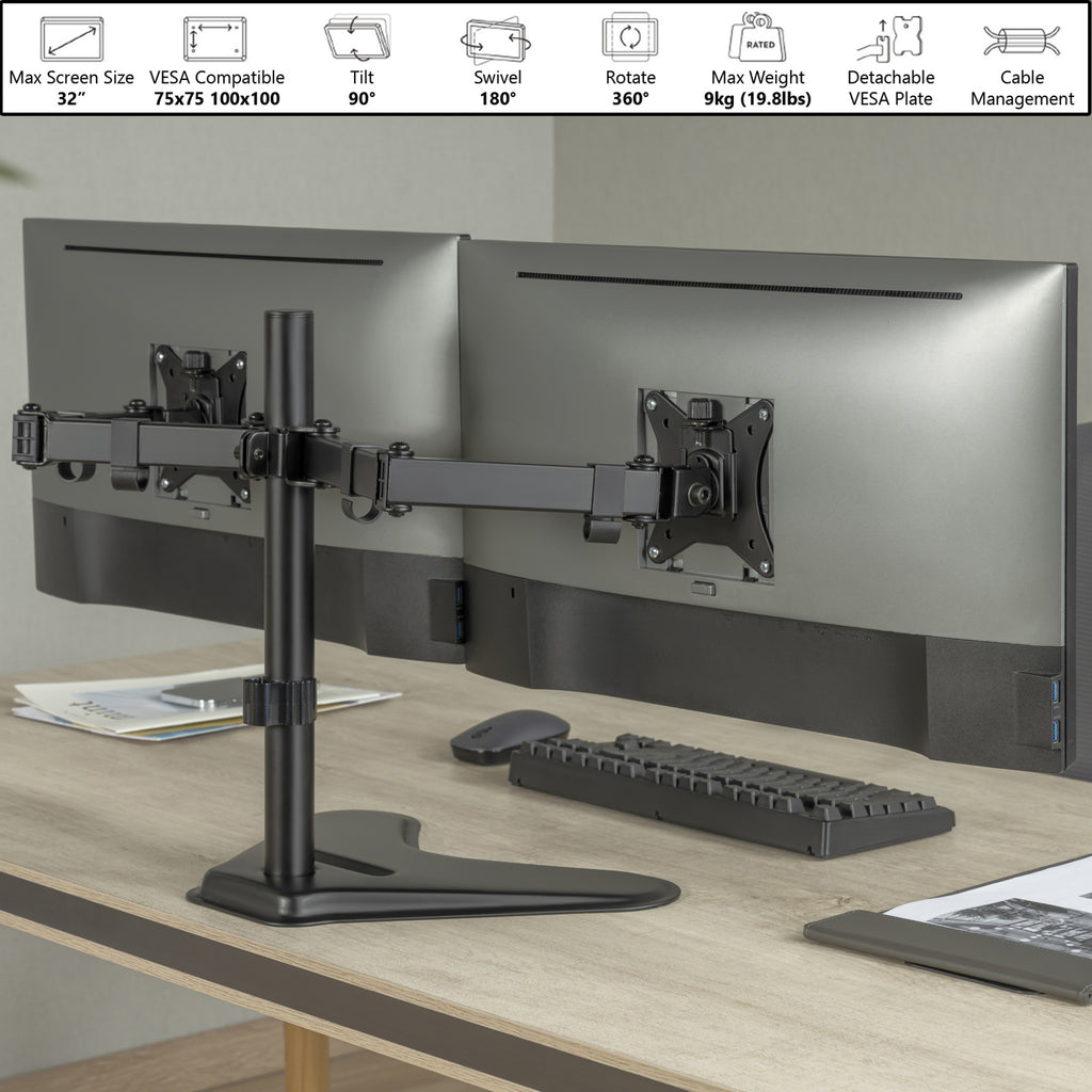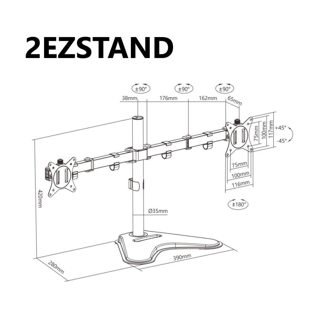 Versatility meets affordability with the 2EZSTAND. The solid articulating monitor arm featuring 90° tilt, 180° swivel, 360° rotation helps create unrivaled ergonomic experience and productivity. The individual VESA Plate height adjustment is designed to enable dual monitors to be perfectly aligned. When updating the monitors, the detachable VESA plate enables a quick and easy attachment. When placed on the desktop, the solid base of smaller size ensures more work space and stable monitor position at any height. The cable management and tool holder offers a clutter-free look.